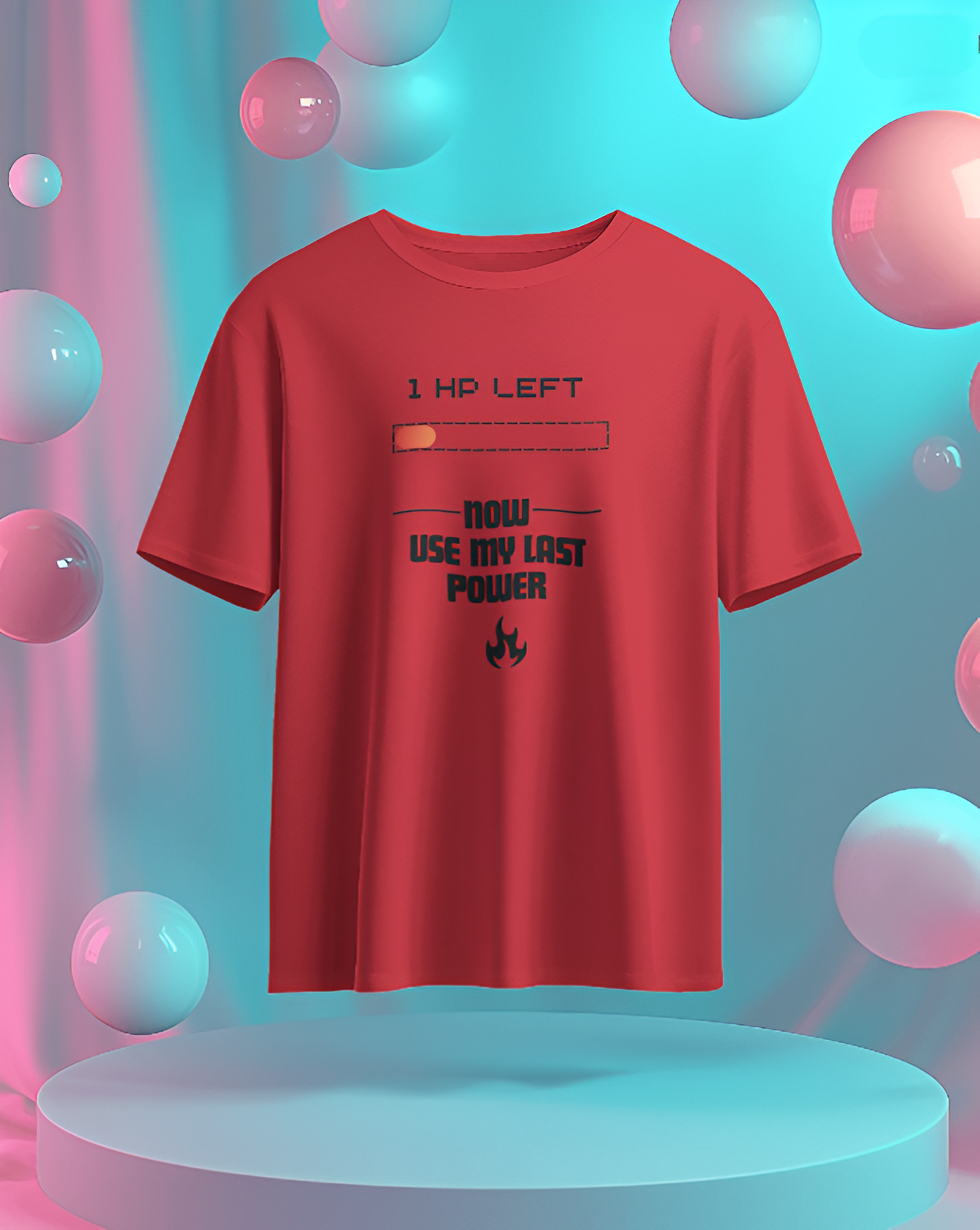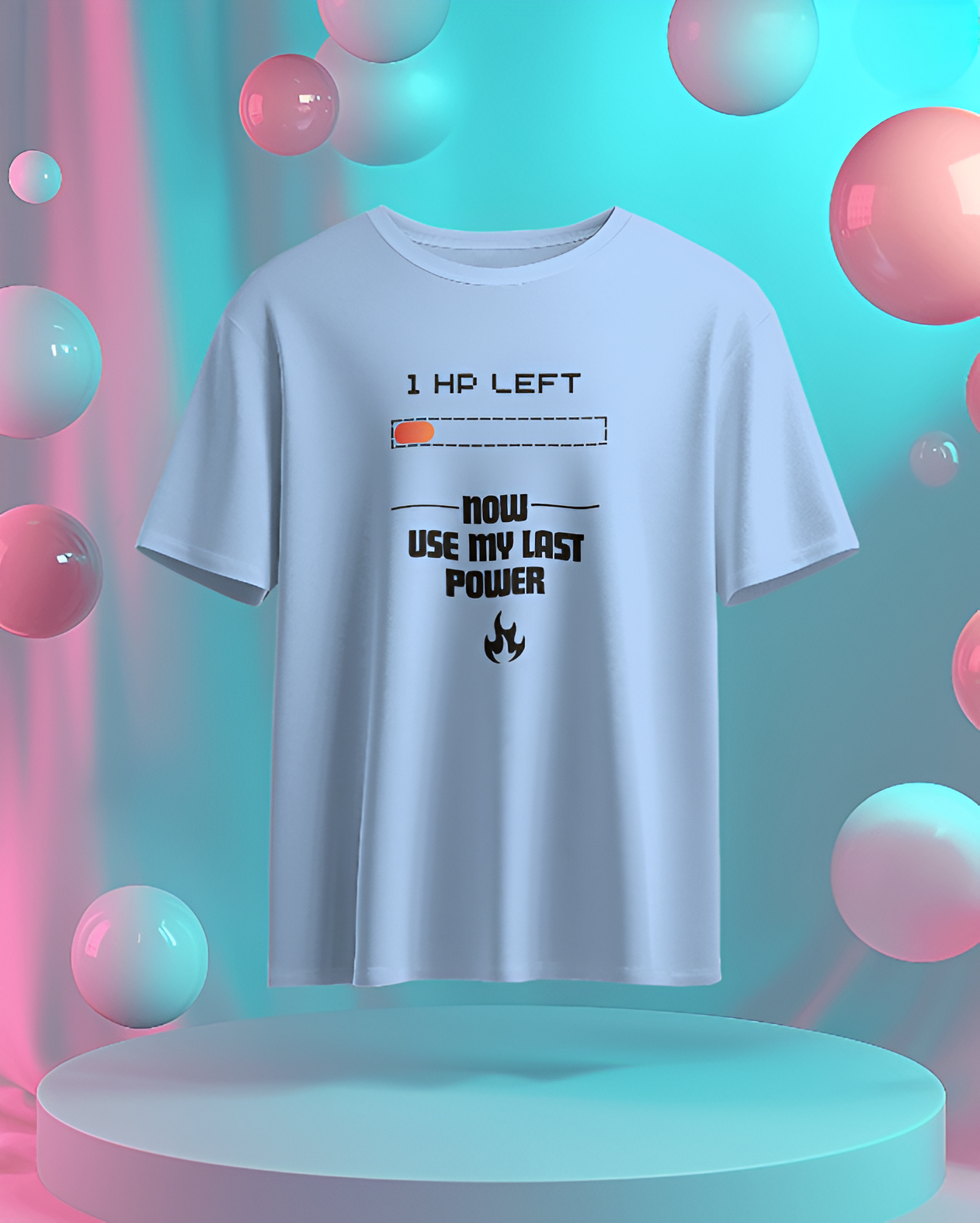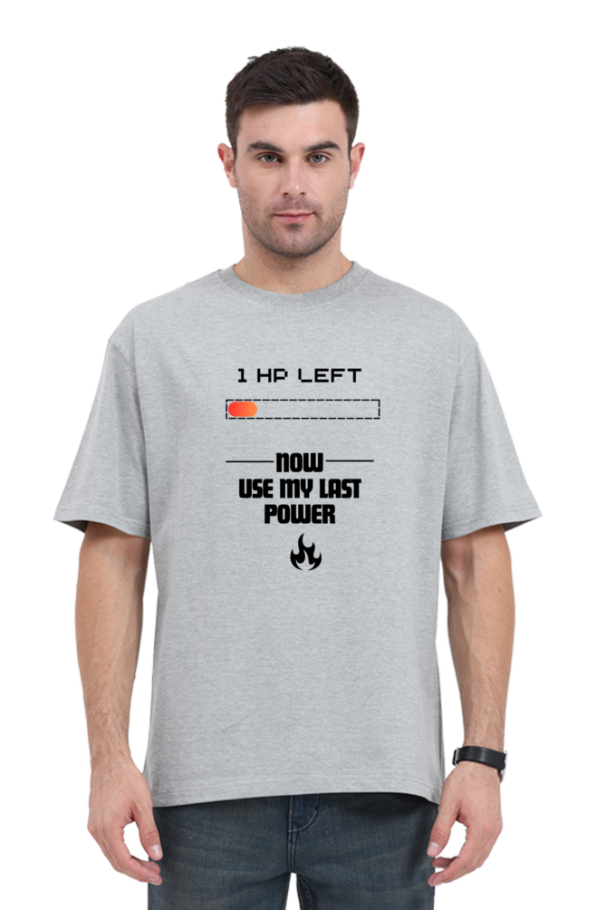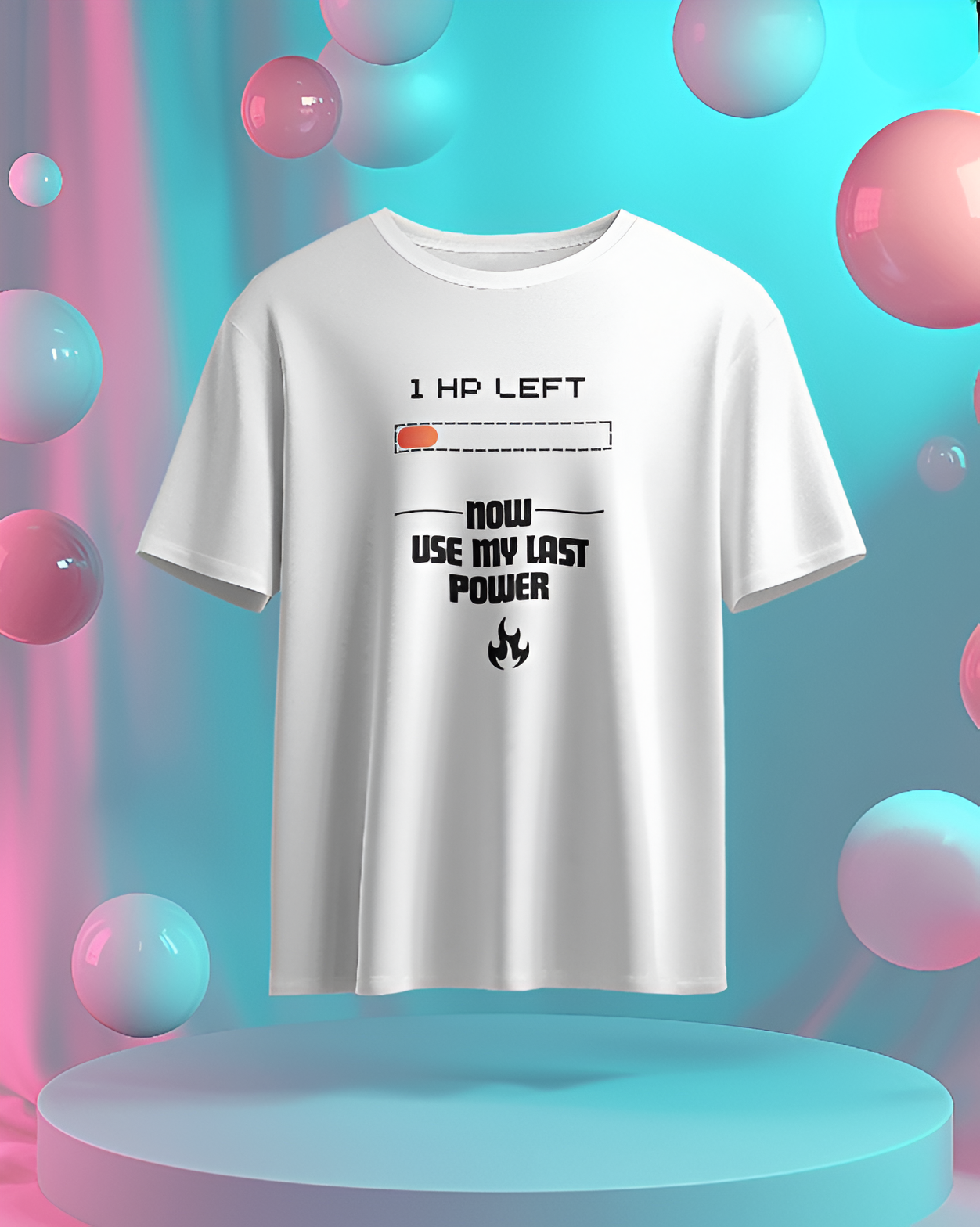 This T-shirt features a pixelated heart with a fading effect, symbolizing the last bit of health in a video game. Below the heart, the phrase “1 HP Left… Now I’m Using My Last Power!” is written in a bold, retro gaming font, creating a nostalgic yet powerful statement. The text has a slight glitch effect to emphasize the intensity of the moment.