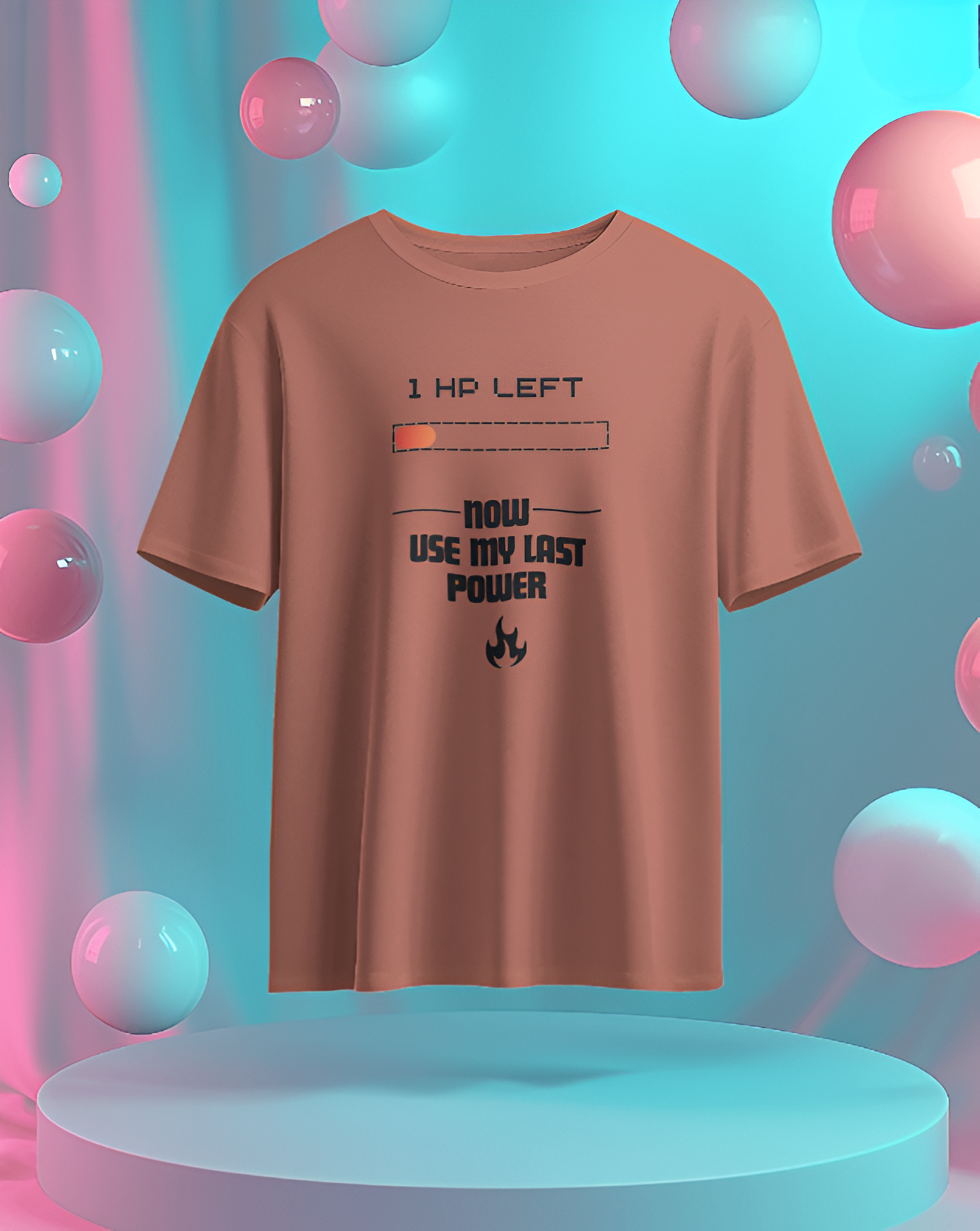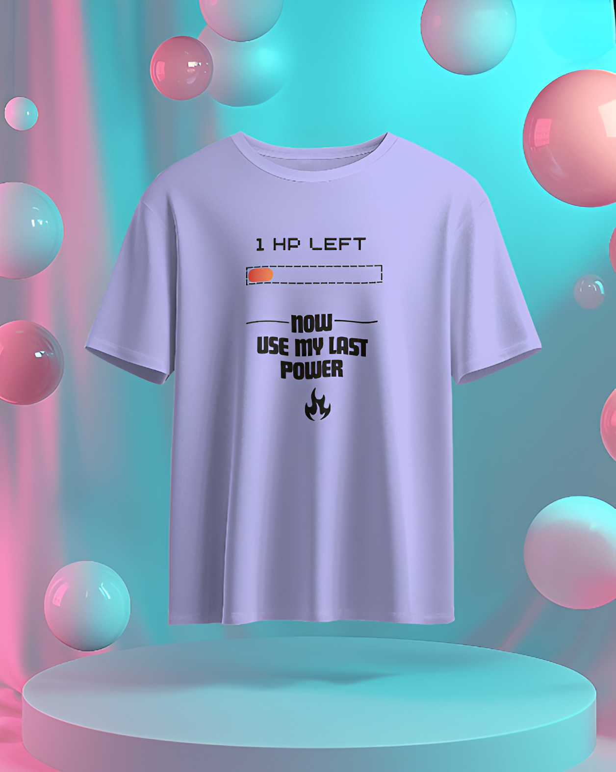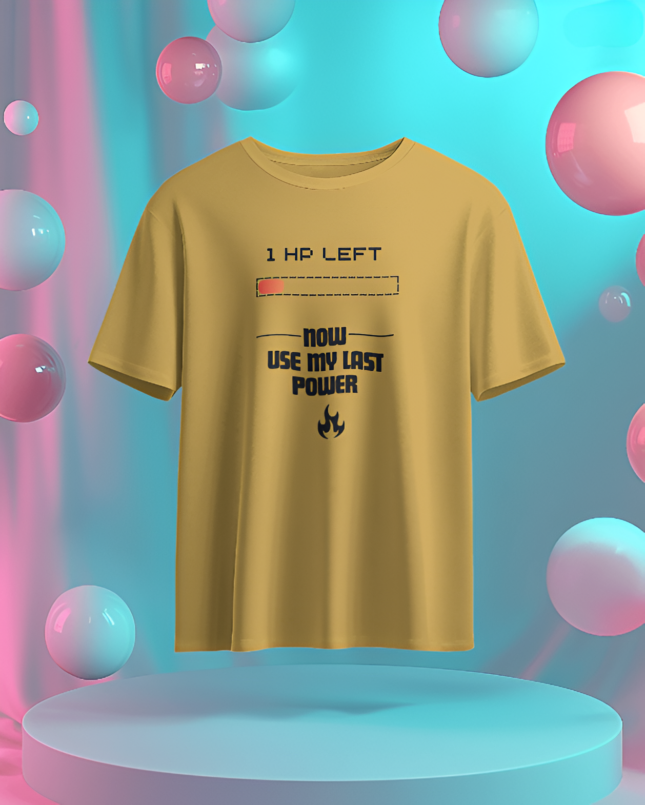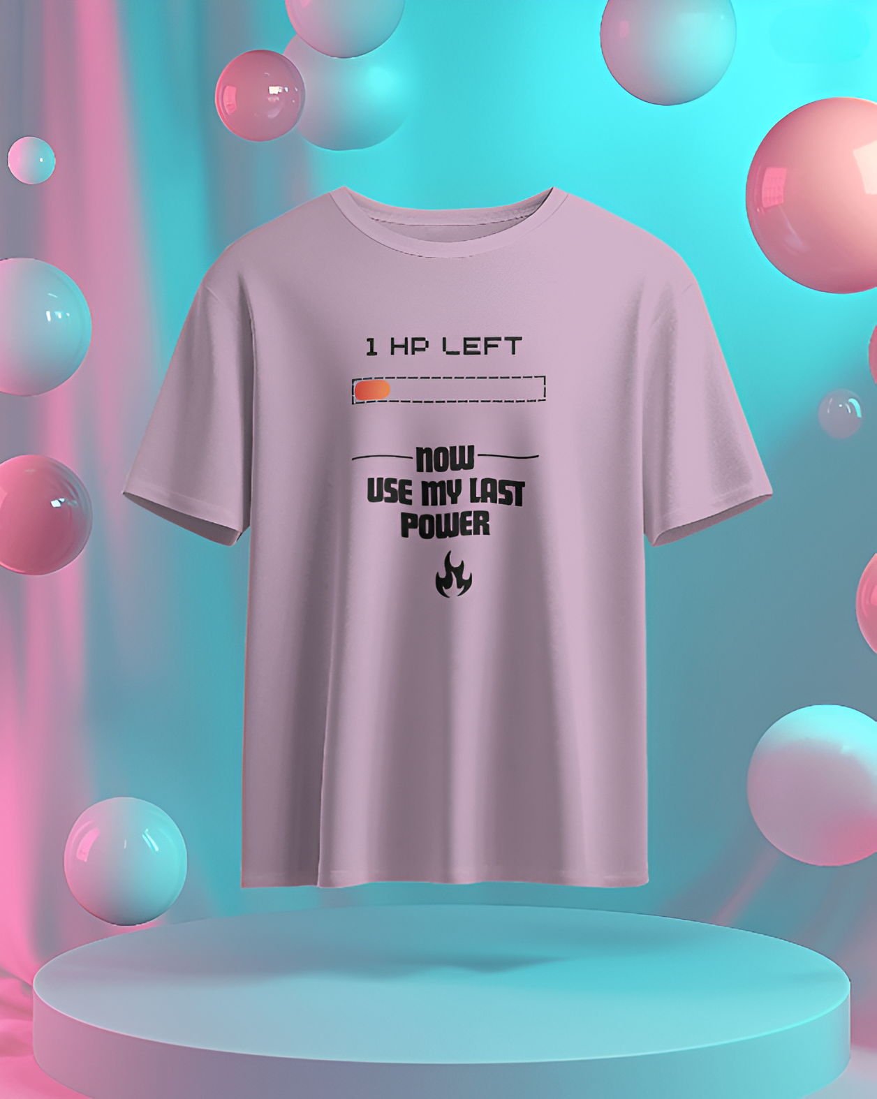 This T-shirt features a pixelated heart with a fading effect, symbolizing the last bit of health in a video game. Below the heart, the phrase “1 HP Left… Now I’m Using My Last Power!” is written in a bold, retro gaming font, creating a nostalgic yet powerful statement. The text has a slight glitch effect to emphasize the intensity of the moment.